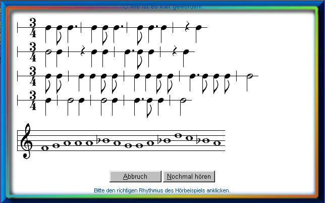 In der Vorübung Liedrhythmen muß der richtige Rhtyhmus eines bekannten Liedes erkannt werden.